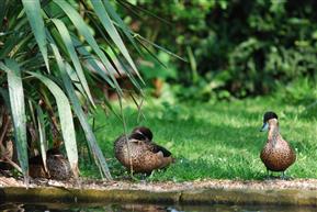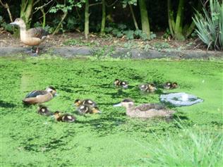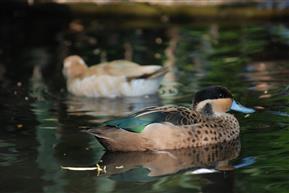 Hottentots can breed at less than a year of age and while they are more productive during the spring and summer they can breed at any time during the year. If maintained in an aviary they are perfectly capable of hatching and raising their own young and the male while not taking any part in the incubation process is certainly involved in the rearing of the young. A pair of Hottentot with their brood of diminutive ducklings is a delightful sight. Hottentots do not lay large clutches, a clutch can consist of between four and eight pale pink / brown eggs and six or seven is the norm with incubation at about 24 days. For a small duck the eggs are quite surprisingly large. Hatching is not normally difficult and a high success rate can be expected using any form of incubation.[If suitable vegetation is available Hottentots will make a natural nest but they will readily use nest boxes either on the ground or raised. If the adults are left to rear their own young they will find a suitably sheltered site, usually in undergrowth near the pond and will take the young to the site every evening until the young are quite well grown.