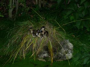 Until the ducklings are about 2 weeks old the female will take the ducklings off the water at night. This is a very poor quality picture but it shows the brood emerging from their roost / overnight shelter. In this instance the duck managed to get her brood into the shelter of a young sedge that had wire round it to precude ducks but somehow the duck would gather all her brood in this site every night.