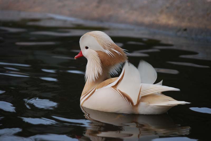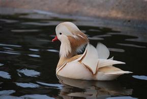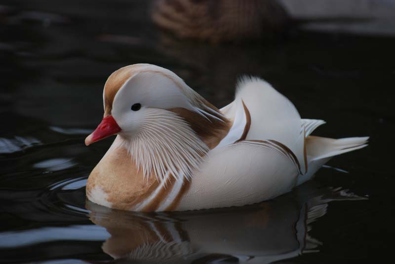 After many generations of captive breeding a number of colour variations of the Mandarin have occurred, it is now possible to get Mandarins in Blond, Silver / White, Ginger and Black. A silver Mandarin drake in full plumage is a particularly impressive sight and there is variation in this colour form. In the generally accepted silver form the females are pure white with a bright red bill and the males are almost white but with feather definitions showing as a light buff and again with the red bill. The variation on this colour form sometimes referred to as Platinum produces females that show feather definition in light buff and the males have a strong feather definition in buff. This new form still needs some improving but really is striking.