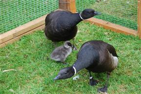 Brent do not easily double clutch and I would never try this unless the pair had reared young in a previous season. They are reliable brooders and make fantastic parents. The eggs have a very short incubation of twenty three days, towards the end of incubation I check the nest daily, the female is not likely to get off the nest. You can just gently partially raise her off the nest so that you can see if the eggs are piped or indeed have hatched. Once the eggs have hatched and the gander is aware that this has happened I usually put a small circle of wire netting around the pair and their nest site and provide them with a shallow drinker and a tray of crumbs. For the first two days young Brent are not very stable on their feet and by confining the adults you can be sure that the goslings are never far from food and water. When the goslings are two or three days old you can either give them access to the whole enclosure or you can move them to a small pen where they can more easily be managed and the adults are restricted from chasing any other waterfowl that venture near.