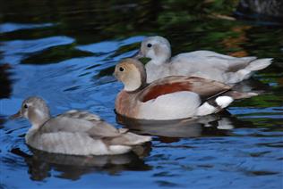 There are at least three colour variations of the Ringed Teal being Blonde, Orange and Blue, the blue is very much rarer than the orange. The colour mutations are nearly as easy to keep and bread as the normals. The Blonde mutation is not particularly impressive being a dilute of the normal and is not nearly as popular as the Orange and Blue forms. The Orange and Blue forms show considerable variation in the colour intensity that provides added interest to observe as a cutch of young mature. The Blue and Orange colour forms would appear to be totally distinct mutations because if you breed from a blue and an orange all the young appear normal in colour.